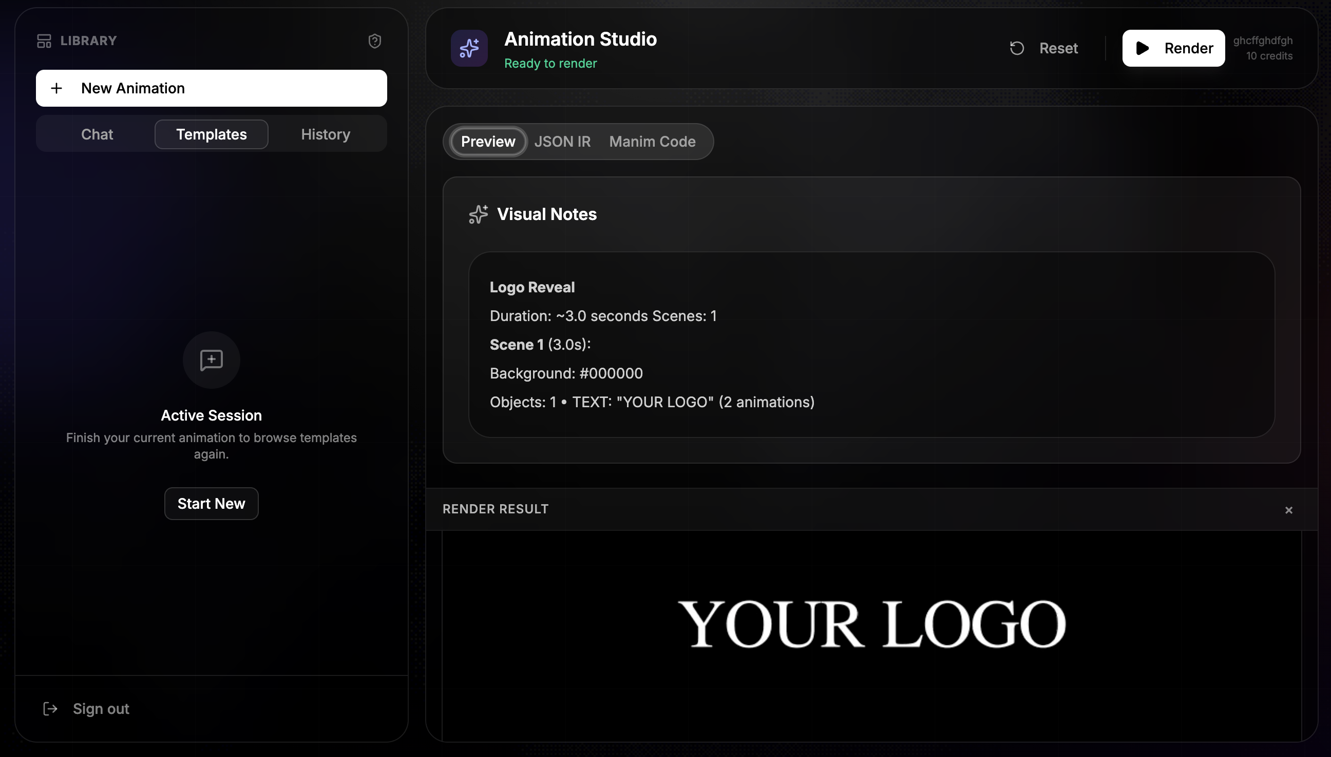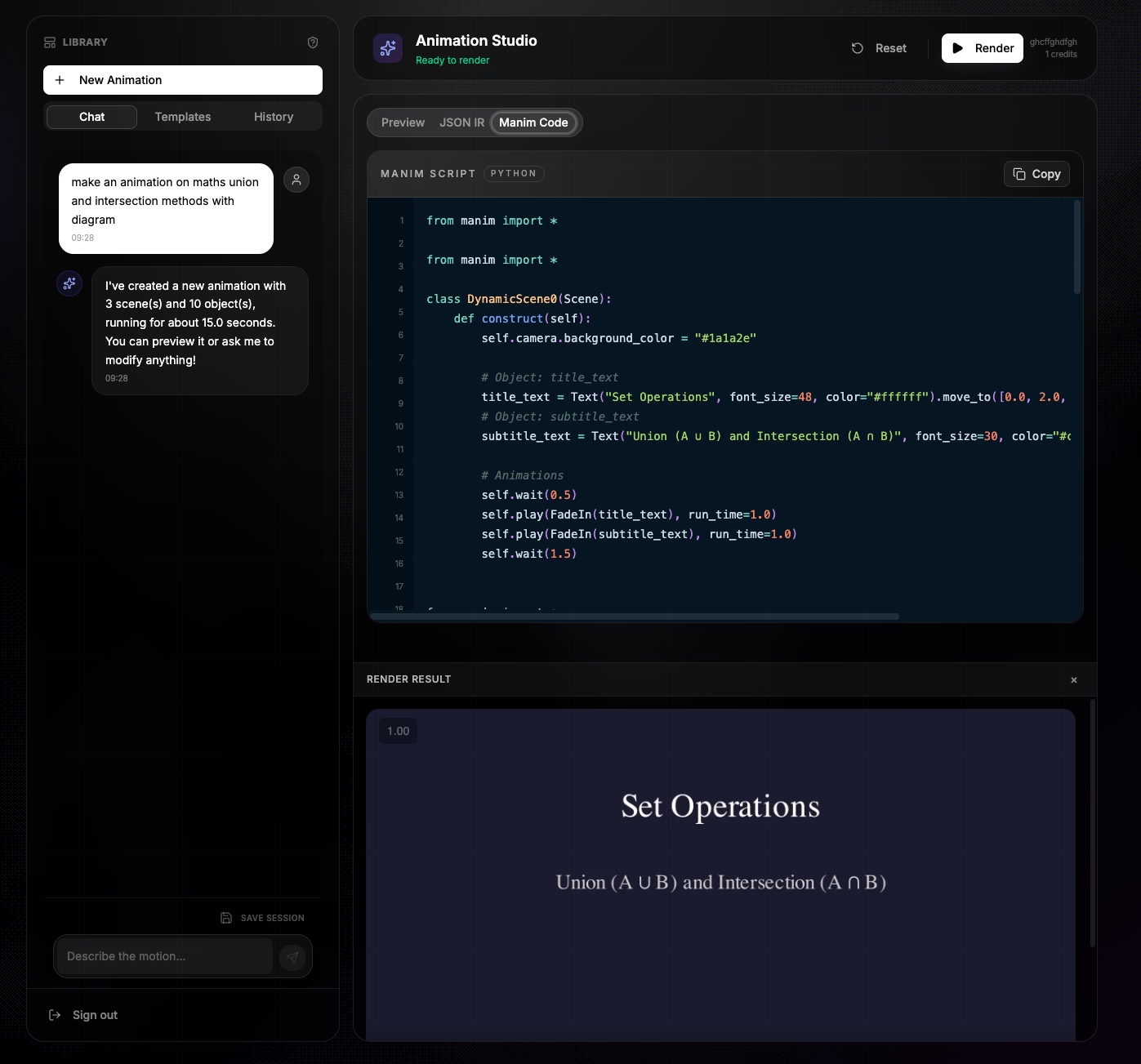 Generate an animation plan (IR), validate it, convert it into Manim code, and render a video — end to end.